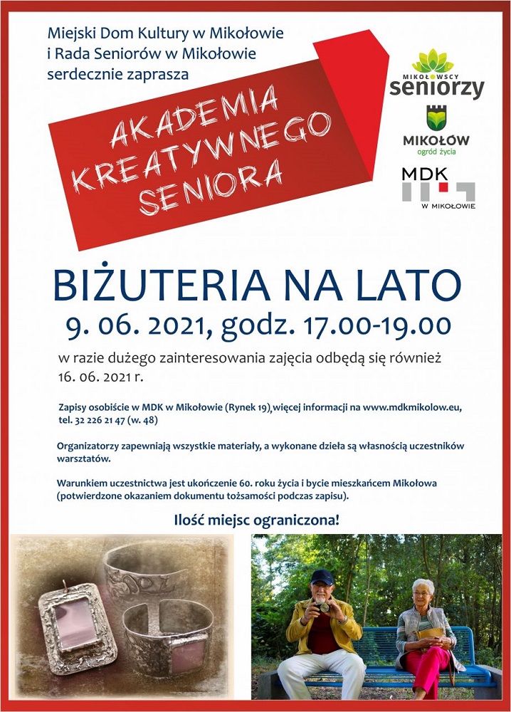 Seniorzy mają okazję wykorzystać swoje zdolności i pobudzić kreatywność na organizowanych przez Miejski Dom Kultury i Radę Seniorów w Mikołowie zajęciach w ramach Akademii Kreatywnego Seniora. MDK zaprasza do tworzenia letniej biżuterii. Zajęcia odbędą się 9 czerwca w godzinach 17.00-19.00 (jeśli będzie dużo chętnych – także 16 czerwca w tych samych godzinach).
