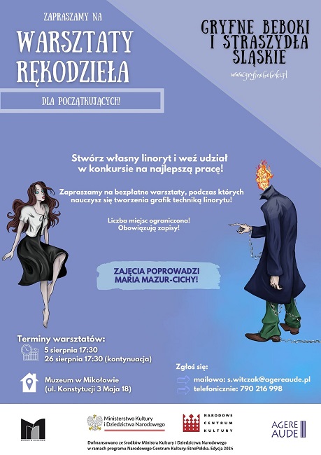 Warsztaty odbędą się w Sali Audiowizualnej Muzeum w Mikołowie przy ul. Konstytucji 3 Maja 18. Projekt „Gryfne beboki i straszydła śląskie” został dofinansowany ze środków Ministra Kultury i Dziedzictwa Narodowego w ramach programu Narodowego Centrum Kultury: EtnoPolska. Edycja 2024.