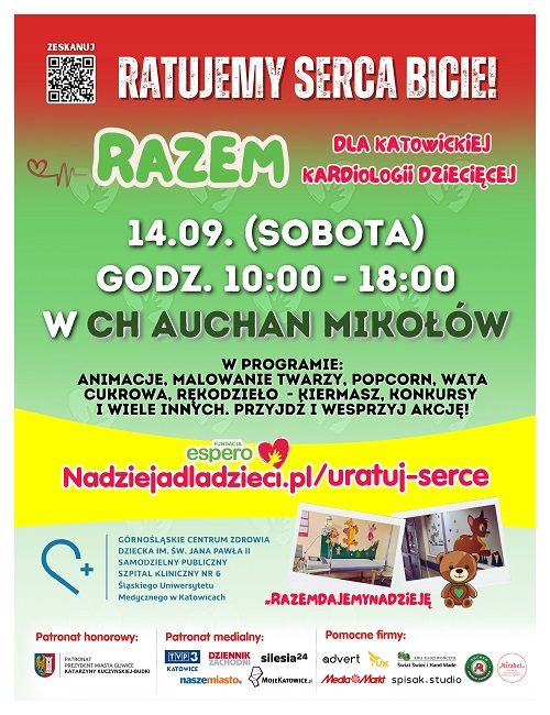 Już 14 września 2024 roku Fundacja Espero zaprasza na wyjątkowe wydarzenie charytatywne pod hasłem „Ratujemy serca bicie! Razem dla katowickiej kardiologii dziecięcej”, które odbędzie się w Ch Auchan. Celem wydarzenia jest wsparcie oddziału kardiologii dziecięcej Górnośląskiego Centrum Zdrowia Dziecka w Katowicach poprzez zbiórkę funduszy na zakup nowoczesnych kardiomonitorów.