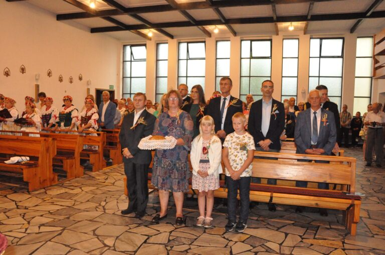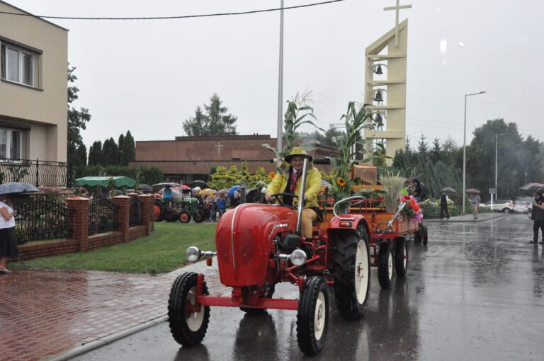 Mimo deszczowej pogody uczestnicy dożynek stawili się tłumnie najpierw na mszy świętej z tej intencji, a następnie przemaszerowali na pobliski teren przy boisku, aby kontynuować świętowanie.