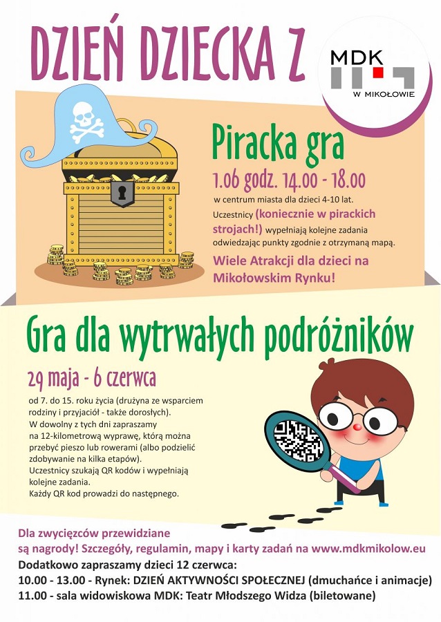 1 czerwca na mikołowskim Rynku będą czekały na Was specjalne atrakcje. W godzinach 14.00-18.00 zapraszamy do udziału w PIRACKIEJ GRZE dla dzieci w wieku 4-10 lat. Musicie przebrać się za pirata i odwiedzić kolejne punkty z otrzymanej mapy, wypełniając proste zadania kwalifikujące Was na piratów i piratki, sprawdzające takie cechy jak waleczność, wytrwałość, zwinność, spostrzegawczość, celność. Jeśli odwiedzicie wszystkie punkty, uskładacie z rozdanych fragmentów mapę skarbu, a w nim�Ś złote dukaty. Dla pierwszych 150 dzieci kupon na gałkę lodów – przekazuje mikołowski MDK.