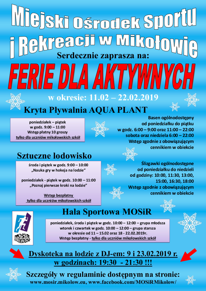 Będzie ona odbywać się od poniedziałku do piątku w terminie 11.02 – 22.02.2019 r. w obiektach administrowanych przez MOSiR Mikołów.