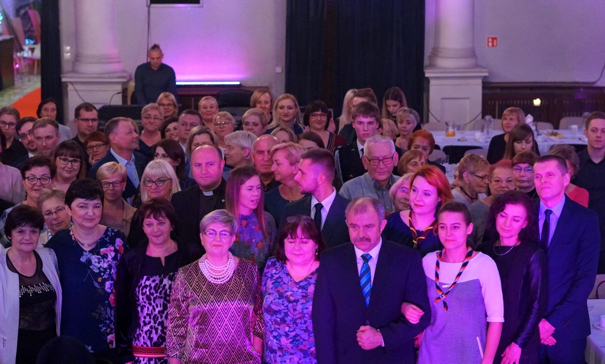Zgromadzeni w sali Miejskiego Domu Kultury goście zatańczyli poloneza, później uraczono ich okolicznościowym tortem i zaproszono do wspólnej zabawy.