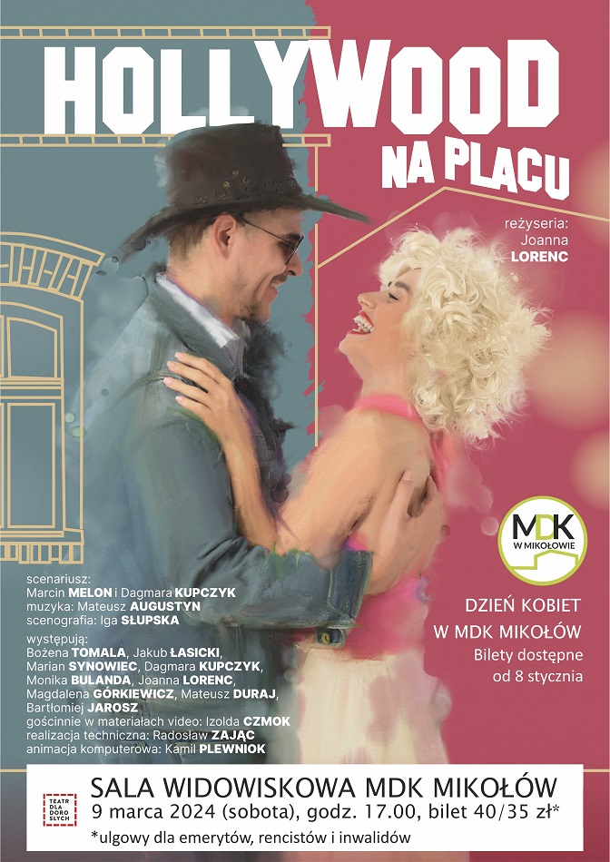 W sobotę, 9 marca, MDK w Mikołowie zaprasza na znakomity spektakl z okazji Dnia Kobiet – “Hollywood na placu” w wykonaniu Teatru dla Dorosłych z Bierunia, który ostatnio zachwycił widzów przedstawieniem “Chop od mojij baby”.