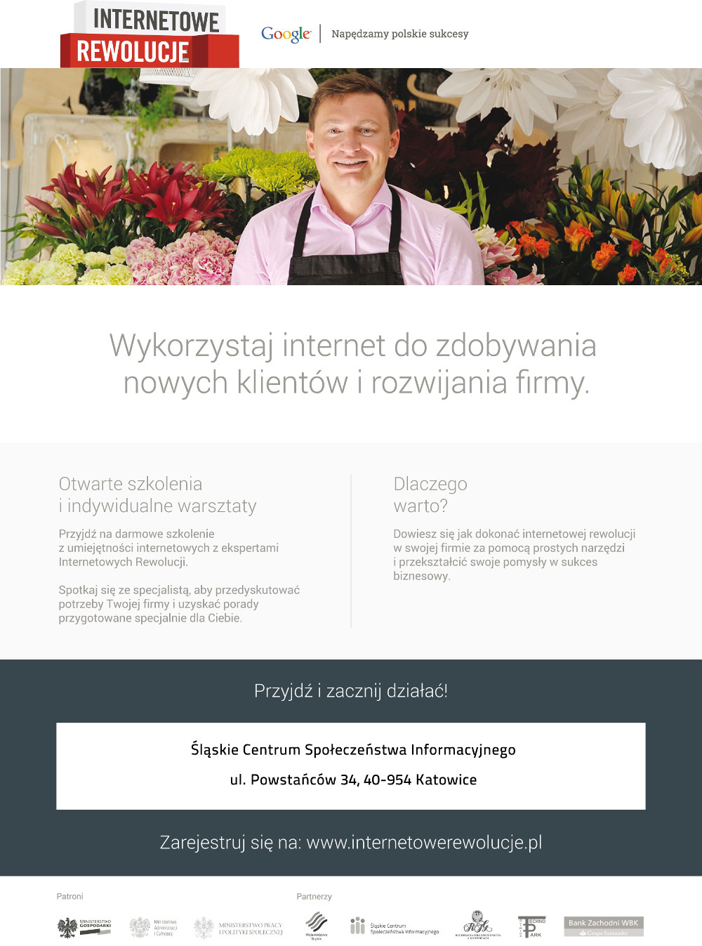 Google przy współpracy ze Śląskim Centrum Społeczeństwa Informacyjnego zaprasza do udziału w programie Internetowe Rewolucje, który ma na celu pomoc małym i średnim przedsiębiorstwom w zdobywaniu umiejętności internetowych.