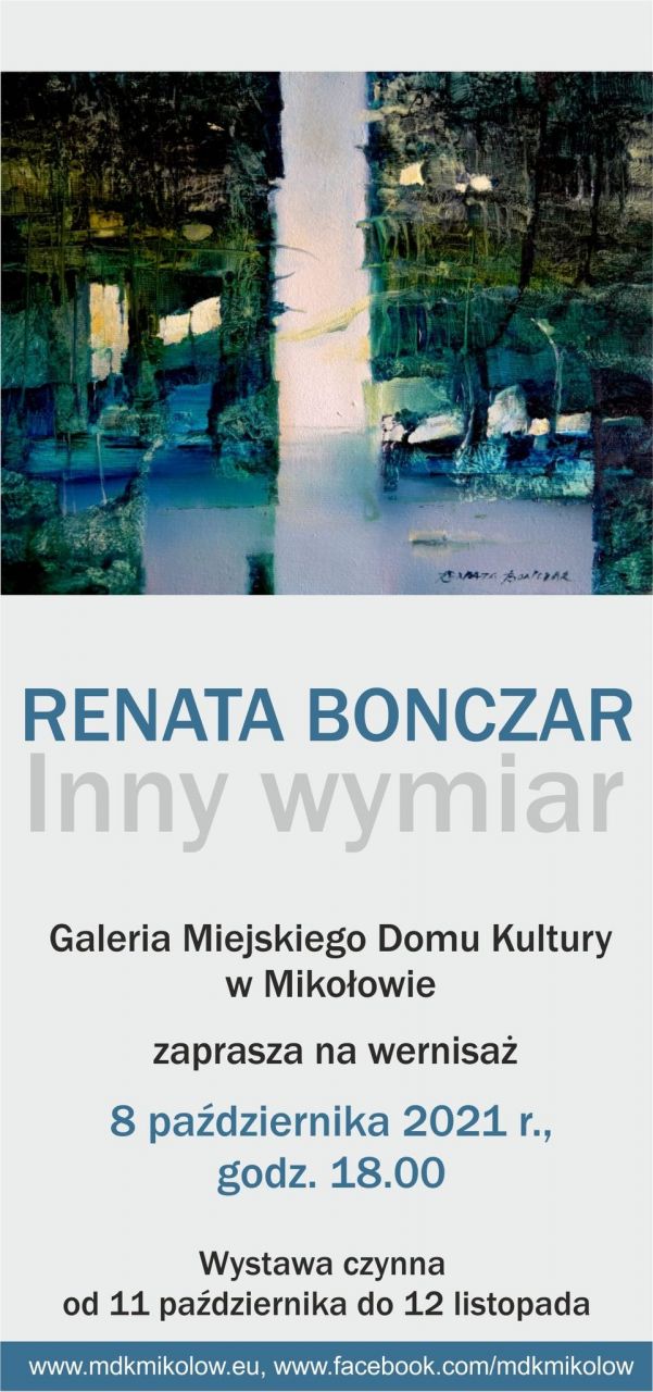 Miejski Dom Kultury w Mikołowie zaprasza na wernisaż wystawy dzieł Renaty Bonczar w Galerii MDK 8 października o godz. 18.00. Wystawa będzie dostępna dla odwiedzających od 11 października do 12 listopada.