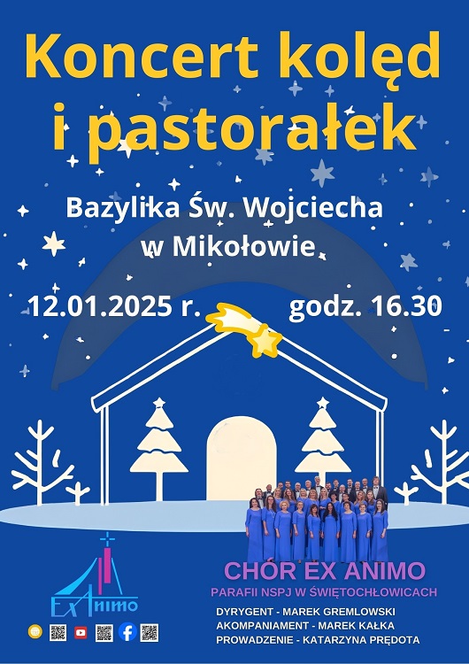 Już 12 stycznia 2025 roku o godzinie 16:30 w Bazylice Św. Wojciecha w Mikołowie odbędzie się wyjątkowy koncert kolęd i pastorałek w wykonaniu Chóru Ex Animo z Parafii NSPJ w Świętochłowicach. Wydarzenie jest doskonałą okazją, by przedłużyć świąteczną atmosferę i wspólnie śpiewać najpiękniejsze melodie.