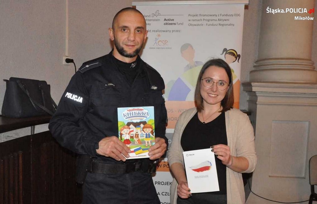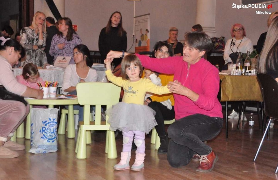 Policyjny profilaktyk z Komendy Powiatowej Policji w Mikołowie wziął udział w spotkaniu z uchodźcami z objętej wojną Ukrainy, które odbyło się w mikołowskim domu kultury.