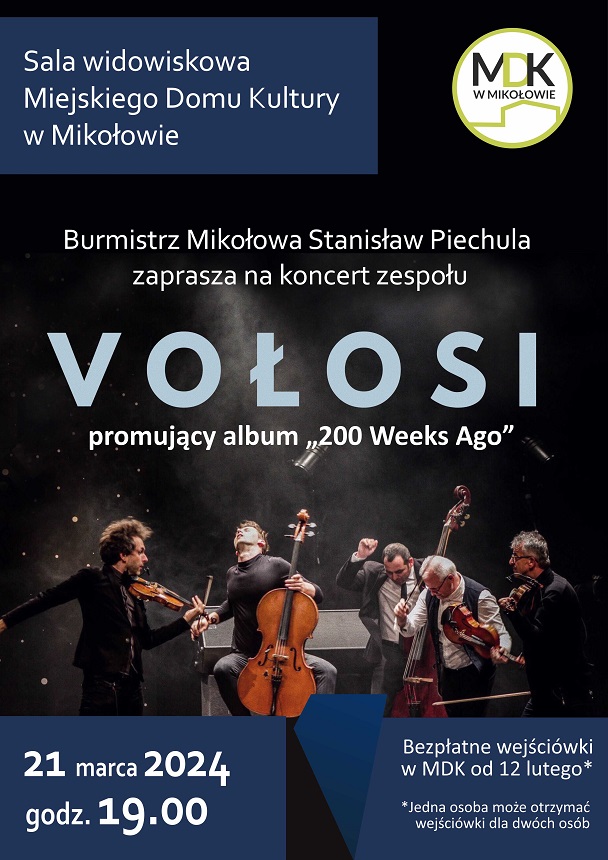 W pierwszy dzień wiosny o godz. 19.00 Burmistrz Mikołowa Stanisław Piechula serdecznie zaprasza do MDK na koncert grupy VOŁOSI, promujący album “200 Weeks Ago”. Bezpłatne wejściówki do odbioru w MDK od 12 lutego (maksymalnie dwie na osobę).