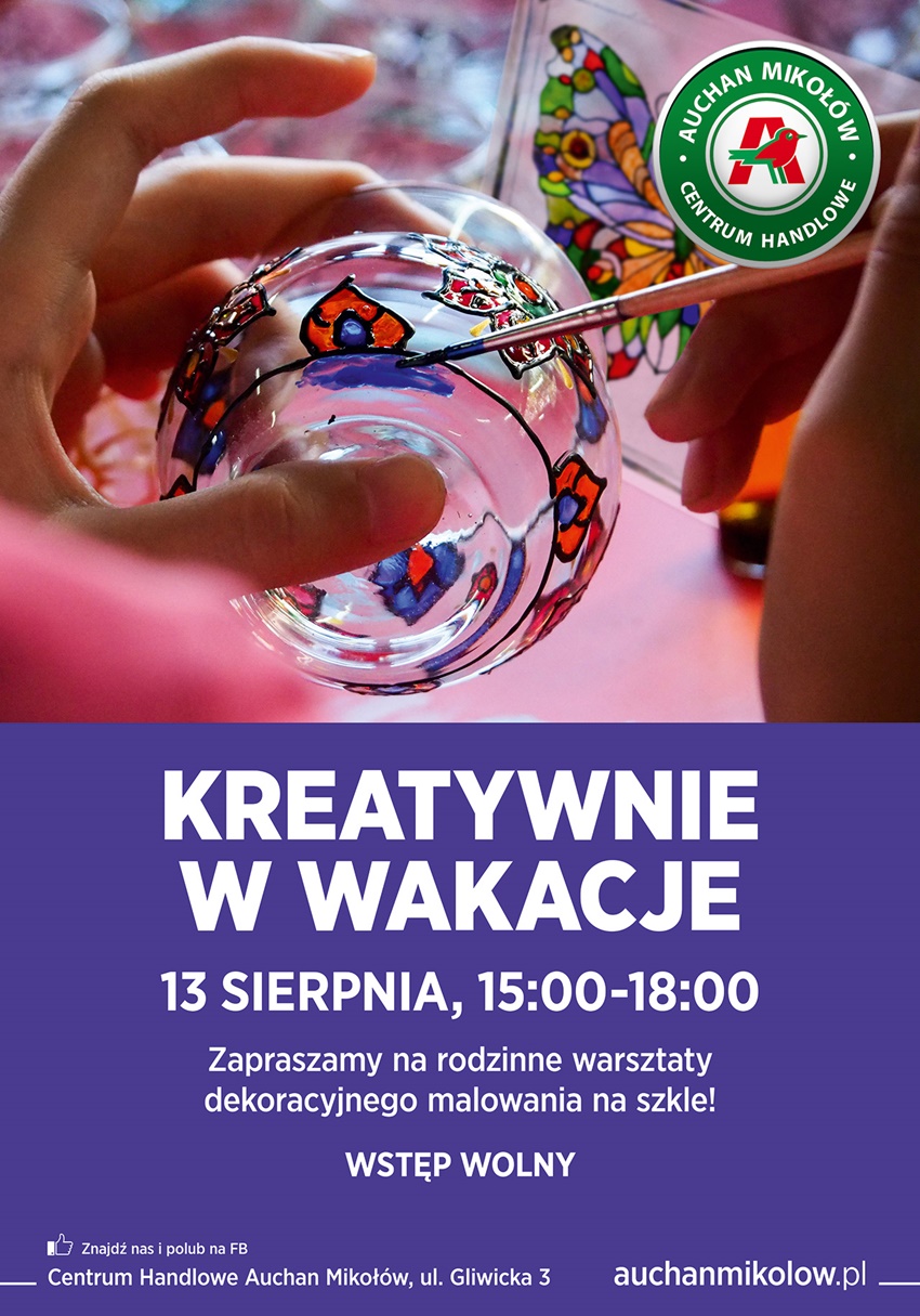 Udział w warsztatach kreatywnych, podczas których każdy może rozwinąć swoje zdolności manualne i fantazję to dobry sposób na wakacje w mieście! W najbliższą sobotę 13 sierpnia Centrum Handlowe Auchan Mikołów zaprasza do udziału w spotkaniu pt. “Kreatywnie w wakacje”, podczas którego będzie można poznać technikę malowania na szkle.