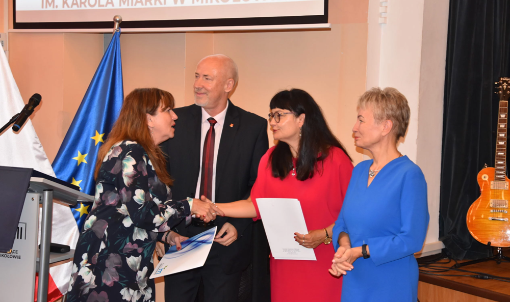 W dalszej części uroczystości starosta Mirosław Duży wręczył nagrody trojgu nauczycielom I LO. Byli to poza dyrektor Barbarą Modzielewską, nauczyciele wychowania fizycznego Paweł Stobiecki i Zbigniew Długaj. Połączono się również zdalnie z Markiem Kamińskim, z którego fundacją szkoła współpracuje.