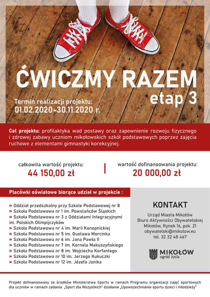 Gmina Mikołów otrzymała ze środków Ministerstwa Sportu w ramach Funduszu Zajęć Sportowych dla Uczniów dofinansowanie w wysokości 20 000 zł na zorganizowanie bezpłatnych zajęć gimnastyki korekcyjnej dla uczniów.