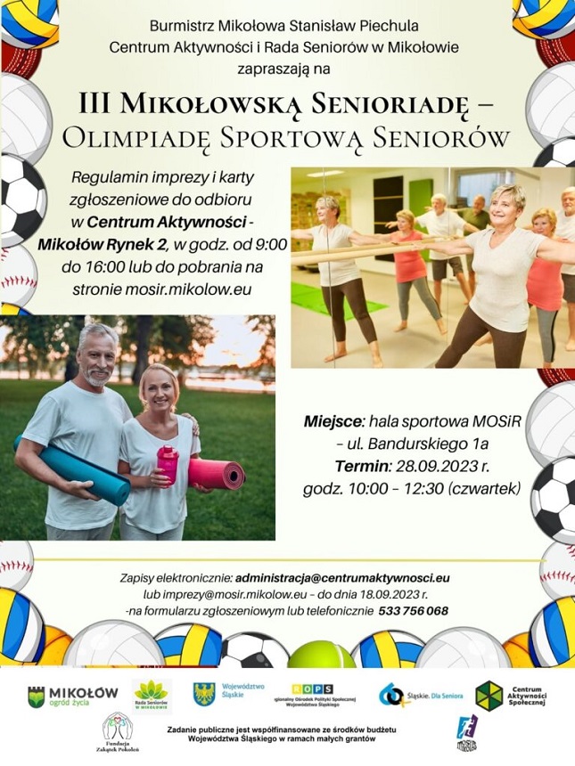 Miejski Ośrodek Sportu i Rekreacji w Mikołowie wraz ze Związkiem Stowarzyszeń Centrum Aktywności oraz Radą Seniorów w Mikołowie serdecznie zapraszają seniorów do wzięcia udziału w III MIKOŁOWKSIEJ SENIORIADZIE – Olimpiadzie Sportowej Seniorów, która odbędzie się 28 września br. (sobota) o godzinie 10.00 w Hali Sportowej MOSiR.