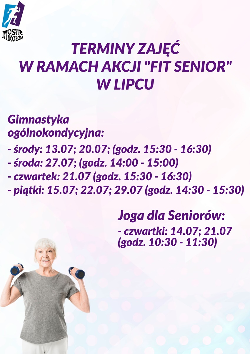 MOSIR Mikołów informuje, iż zajęcia dla Seniorów w ramach akcji „Fit Senior” w lipcu będą odbywały się wg poniższego harmonogramu.