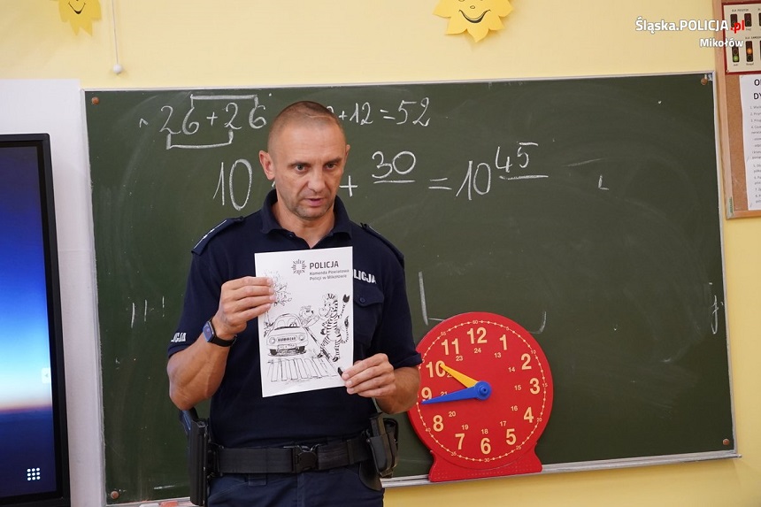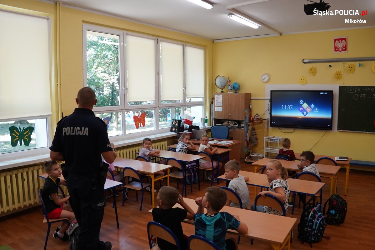Uczniowie pierwszych klas Szkoły Podstawowej nr 5 w Mikołowie spotkali się wczoraj w policyjnym profilaktykiem. Dzieci, które właśnie rozpoczęły edukację szkolną powinny znać podstawowe reguły ruchu drogowego. Aspirant Artur Ceran zachęcał młodych mikołowian do noszenia odblasków, bycia ostrożnym i kulturalnym nie tylko na szkolnych korytarzach, ale także i na chodniku.
