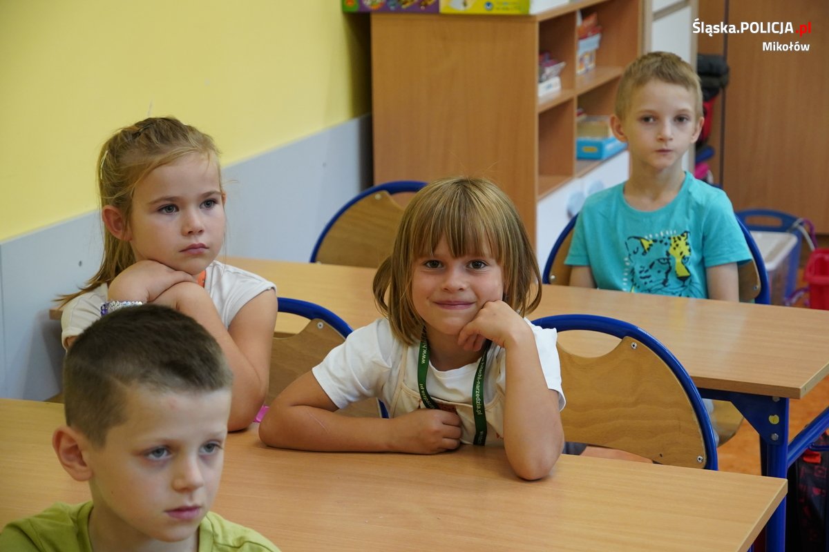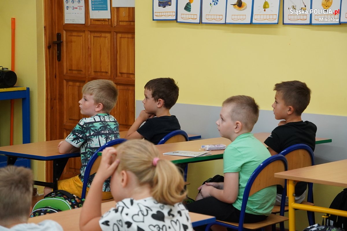 Pierwszoklasiści z Mikołowa podczas lekcji z policyjnym profilaktykiem