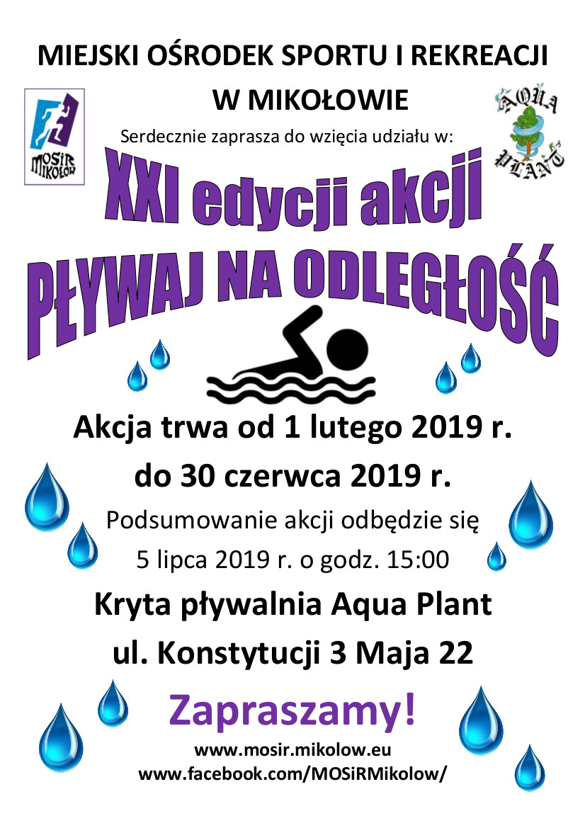 Serdecznie zapraszamy wszystkich miłośników pływania do wzięcia udziału w XXI edycji akcji “Pływaj na odległość”, która odbywać się będzie w krytej pływalni Aqua Plant przy ul. Konstytucji 3 Maja 22, podczas godzin ogólnodostępnych.