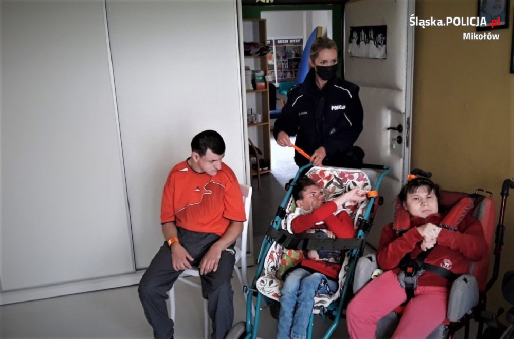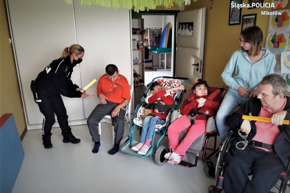 Policjanci z mikołowskiej komendy spotkali się z podopiecznymi ośrodka dla niepełnosprawnych w Mikołowie, aby przekazać im elementy odblaskowe, które wykorzystają głównie podczas jesiennych spacerów. Powoli zbliża się bowiem czas, kiedy piesi na drodze, w tym także osoby poruszające się na wózkach, powinny być wyposażone w dodatkowe opaski, zawieszki bądź inne gadżety, które zwiększą ich widoczność na drodze.