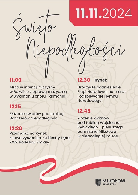 Z okazji Narodowego Święta Niepodległości Burmistrz Mikołowa Stanisław Piechula zaprasza mieszkańców do wspólnego świętowania. Obchody rozpoczną się o godzinie 11:00 w Bazylice, gdzie odbędzie się Msza Święta w intencji Ojczyzny z wyjątkową oprawą muzyczną w wykonaniu Chóru Harmonia. Po mszy nastąpi złożenie kwiatów pod tablicą Bohaterów Niepodległości, upamiętniając zasłużonych w walce o wolność.