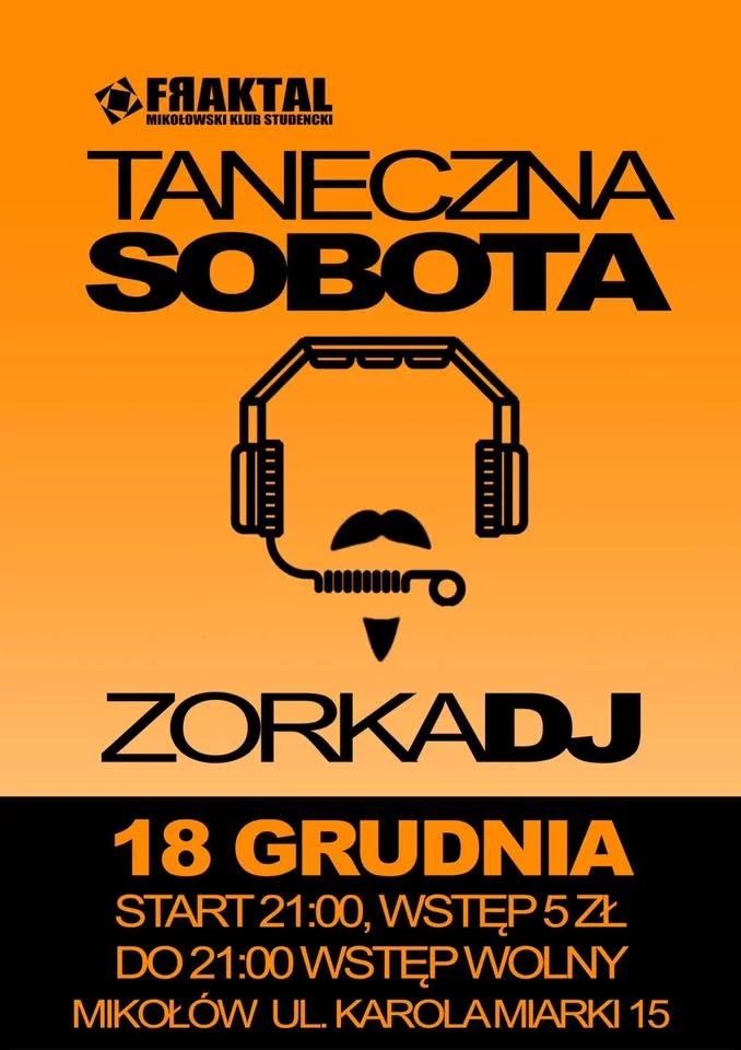 W najbliższą sobotę 18 grudnia w Klubie Fraktakl wystąpi DJ Zorka. Początek imprezy o godzinie 21:00, do tego czasu wstęp bezpłatny, później – 5 zł za osobę.