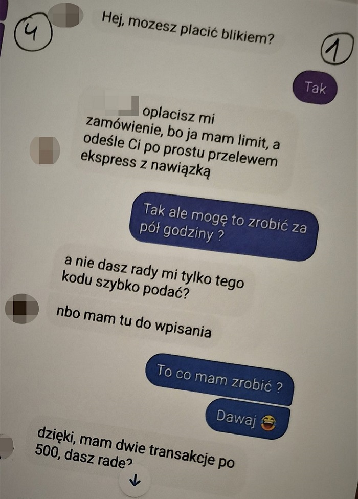 O tej metodzie działań oszustów słychać już od dłuższego czasu. Polega na włamaniu się i przejęciu konta na portalu społecznościowym oraz proszeniu za pomocą komunikatora znajomych właściciela konta o udostępnienie kodu BLIK. Zazwyczaj chodzi o kwoty rzędu kilkuset złotych, a przestępcy podszywający się pod właściciela konta tłumaczą się np. tym, że właśnie robią zakupy i zapomnieli portfela. Oszuści dysponując kodem BLIK mogą bez problemu wypłacić gotówkę z bankomatu albo zapłacić za zakupy przez Internet. Co prawda, właściciel konta musi potwierdzić transakcję, ale robi to wierząc, że pomaga swojemu znajomemu, który znalazł się w potrzebie.