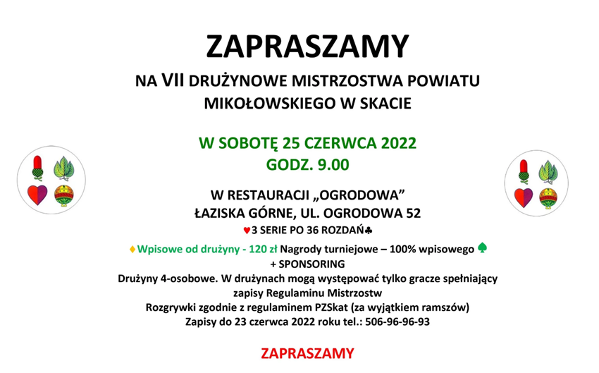 Rozgrywki będą odbywały się zgodnie z regulaminem PZSkat (za wyjątkiem ramszów). Zapisy potrwają do 23 czerwca 2022 roku pod numerem telefonu 506-96-96-93.