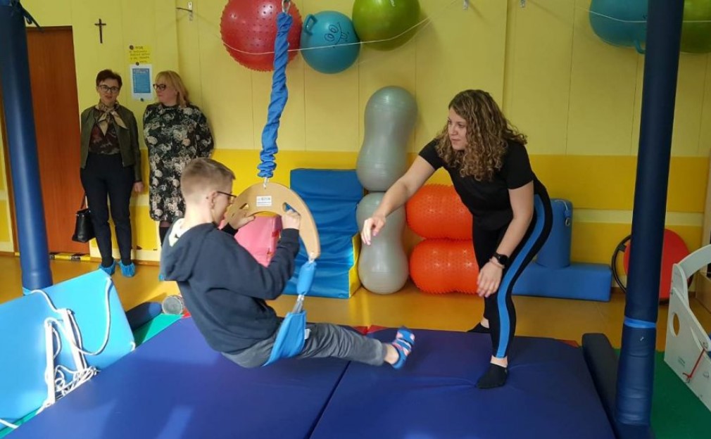 Podczas otwarcia sali do rehabilitacji ruchowej i zajęć SI działania poszczególnych urządzeń zaprezentował uczeń Adam, który ze wsparciem fizjoterapeutki pani Izabelli ćwiczył na kładce do ćwiczeń równoważnych, beczce, huśtawce (helikopter, trapez platforma), równoważni kołysce oraz na trampolinie z poręczą i pagórkach.