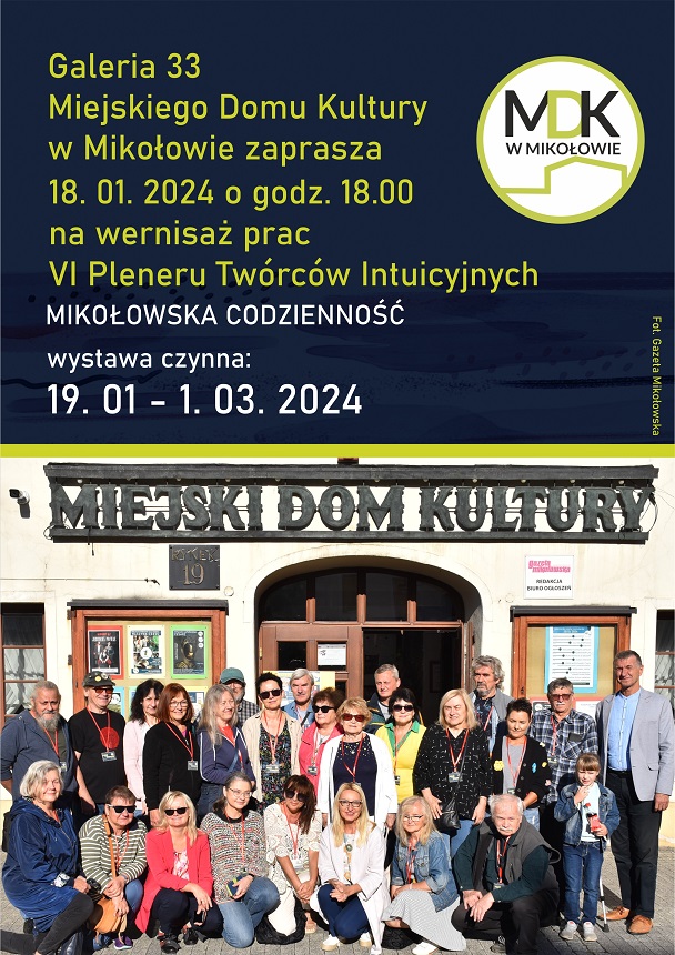18 stycznia o godz. 18.00 MDK w Mikołowie zaprasza do Galerii 33 na wernisaż wystawy podsumowującej VI Plener Twórców Intuicyjnych, który pod hasłem “Mikołowska codzienność” odbył się 16 września.