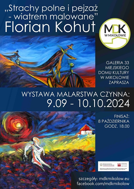 W dniach 9 września – 10 października 2024 r., w Galerii 33 w Mikołowie, odbędzie się wyjątkowa wystawa malarstwa Floriana Kohuta zatytułowana “Strachy polne i pejzaż – wiatrem malowane”. Kulminacyjnym punktem wydarzenia będzie finisaż wystawy, który odbędzie się 8 października o godz. 18:00. Wystawa ta stanowi część projektu “Tradycja żywa. 50-lecie Zespołu Regionalnego Mikołowianki”, który uzyskał dofinansowanie ze środków Ministra Kultury i Dziedzictwa Narodowego w ramach programu Narodowego Centrum Kultury: Kultura – Interwencje. Edycja 2024.