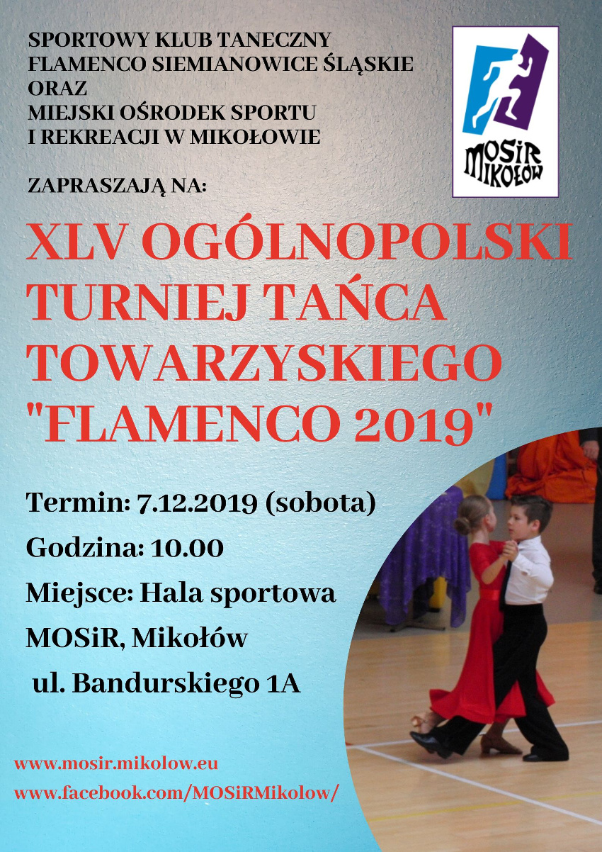 Serdecznie zapraszamy wszystkich miłośników tańca na XLV Ogólnopolski Turniej Tańca Towarzyskiego “Flamenco 2019”, który odbędzie się 7 grudnia br. o godzinie 10:00 w Hali Sportowej MOSiR.