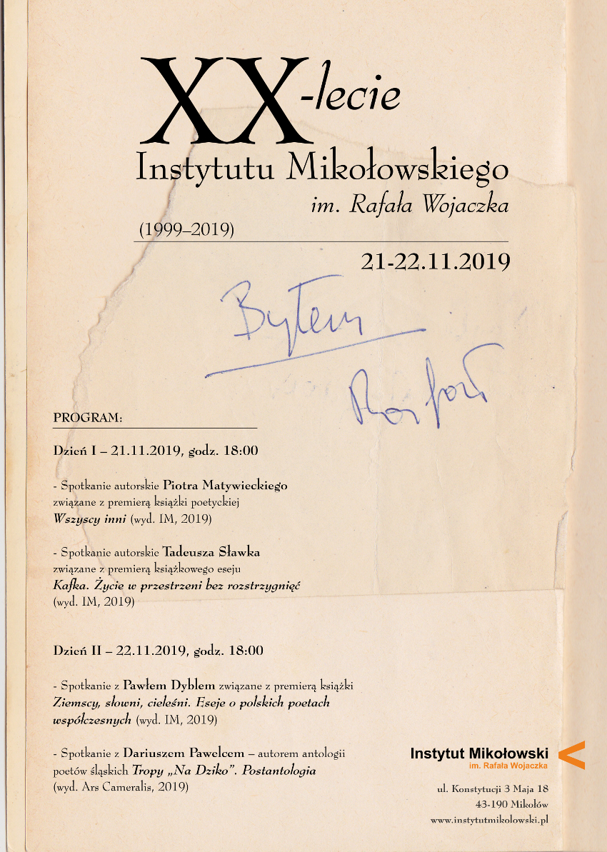 Rzadki to wszak przypadek, ażeby w mieście nieledwie 40 tyś, niemającym konkretnej tradycji literackiej, nagle nastąpiła eksplozja poetycka i literacka. A tak właśnie stało się w Mikołowie u początku lat dziewięćdziesiątych ubiegłego wieku. U progu roku 1999 Rada Miejska Miasta Mikołowa, na wniosek Burmistrza Miasta Marka Balcera powołała do życia Instytut Mikołowski. Pierwszym dyrektorem IM został Paweł Targiel, a pracownikami poeci: Maciej Melecki, Krzysztof Siwczyk i Arkadiusz Kremza. Tym samym redakcja Arkadii – pisma katastroficznego, powstałego w Mikołowie w 1996 roku, znalazła nowe miejsce, i – niejako z marszu – w IM ukazał się kolejny numer pisma, a w raz z nim pierwsza książka afiliowana przy bibliotece pisma. Była nią Reszt krwi, autorstwa Rafała Wojaczka – tom wierszy zawierający nieznane lub niepublikowane dotąd wiersze mikołowskiego poety – w którego dawnym rodzinnym mieszkaniu swą siedzibę otrzymał IM. Działania IM skoncentrowane były nieustannie na kreowaniu życia literackiego i naukowego w postaci rozlicznych spotkań autorskich, organizowaniu sesji naukowych, wydawaniu Arkadii i książek: poetyckich, filozoficznych, naukowych, historycznych, przekładowych. Efektem tych wszystkich dwudziestu lat, jakie upłynęły w kwietniu 2019 r. od momentu powstania instytucji, jest osiągnięcie rangi miejsca wyjątkowego w skali kraju, albowiem nieczęsto się zdarza, by w tak małym mieście – jakim jest Mikołów względem, chociażby, miast ościennych – udało się, dzięki ogromnemu zapałowi ludzi pracujących i współpracujących z IM, stworzyć magnetyczne miejsce dla miłośników literatury i sztuki z całego kraju. IM – jako instytucja i wydawnictwo – stanowczo swymi działaniami dawał wyraz niezgodzie na zalew populistycznej i koniunkturalnej kultury, dostarczającej tylko rozrywkę dostrojoną do masowych gustów, kreując publikowanymi książkami czy organizowanymi spotkaniami nieustanną potrzebę myślenia krytycznego i alternatywnego wobec narzucanych standardów. Niezależność działań, której IM od początku hołdował, daje spore możliwości oferowania odbiorcom szerokiego spektrum indywidualnych aktywności poszczególnych twórców. Badania i interpretacje ich dorobku – czego najdobitniejszym przykładem jest chociażby edycja dzieł wszystkich Witolda Wirpszy, zapoczątkowana w IM od 2005 roku – czyni, podług naszego myślenia, jedyną drogę zmierzającą w stronę przezwyciężenia opresji miernoty współczesnego świata. Publikacja tomów poezji współczesnej, operującej różnorodną skalą wypowiedzi, w której decydującym aspektem jest indywidualny rys języka, jego wielorejestrowe zderzanie i skłócenie (mam tu na myśli takie tomy jak: Pora roku Tomaža Šalamuna, Dziennik rozbitka, Krzysztofa Karaska, Kapsle i etykietki, Andrzeja Niewiadomskiego, Fe, Jerzego Suchanka, Chwila nieuwagi, Marka Forda, Bezczynność butów Rona Padgetta, Ludzkie nieludzkie Piotra Kępińskiego czy Czarny organizm Juliusza Pielichwskiego) koreluje zarazem z masą krytyczną zawartą w książkach eseistycznych ( Świadomość, Piotra Matywieckiego, Złote myśli samobójcze, Marka K. E Baczewskiego, Dziennik. Teksty krytyczne Kazimierza Ratonia, Podania, Cezarego Domarusa, Nie bez reszty Tadeusza Sławka). To właśnie w nich – wydawanych przez IM książkach – czytelnik natknie się na wielorodną wizję świata, którego centralną postacią jest kreująca go jednostka – wymykająca się powierzchownemu odbiorowi i będąca w stanie zwarcia z obiegowymi i banalnymi sądami o jej naturze czy charakterze. Rozwijaniu i eksponowaniu takich właśnie ujęć – przez najbliższe lata – niewątpliwie będziemy poświęcać nasze wysiłki.