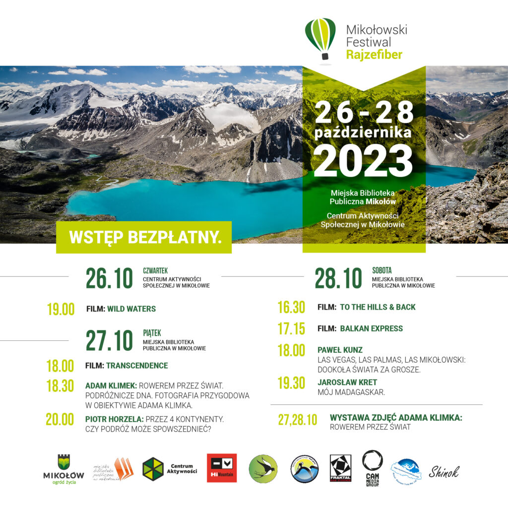 Kolejne dwa dni festiwalu tradycyjnie odbędą się w Miejskiej Bibliotece Publicznej w Mikołowie (ul. Karola Miarki 5). 27 października, czyli piątek, rozpocznie się pokazem filmu “Transcendence,” który zdobył nagrodę za najlepszy film wspinaczkowy podczas tegorocznego Festiwalu Górskiego w Lądku Zdrój. Po seansie odbędą się spotkania z podróżnikami, w tym o 18:30 Adam Klimek podzieli się swoimi fascynującymi historiami z podróży po świecie rowerem i zaprezentuje fotografie ze swoich przygód. Następnie, o godzinie 20:00, na scenie Miejskiej Biblioteki pojawi się Piotr Horzela, który opowie o swoich podróżach przez 4 kontynenty i zastanowi się nad tym, czy takie podróże mogą stać się codziennością.