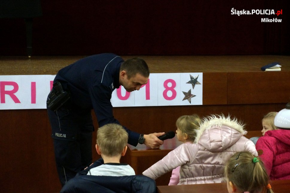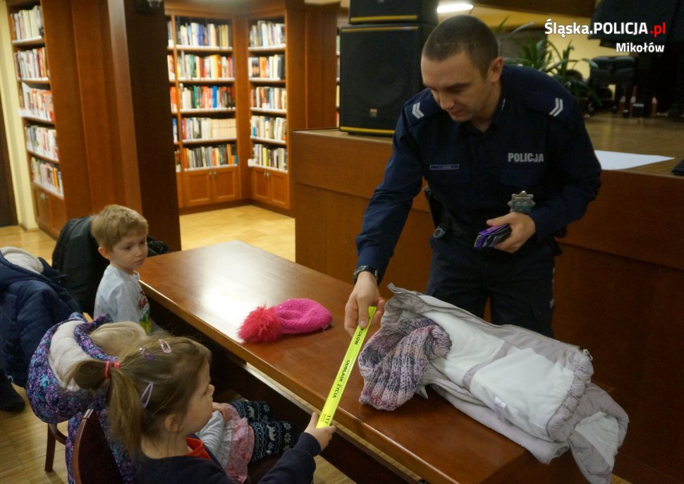 Policjant wydziału prewencji odwiedził dzieci spędzające czas ferii zimowych w Miejskiej Bibliotece Publicznej w Mikołowie. Najmłodsi przypomnieli sobie najważniejsze zasady, o których muszą pamiętać podczas zimowego wypoczynku. Na koniec spotkania, wszystkim uczestnikom wręczono opaski odblaskowe.