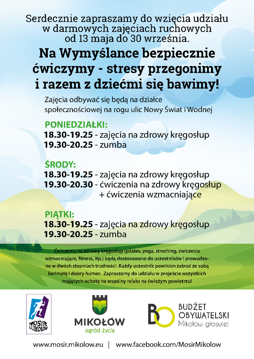 MOSiR Mikołów serdecznie zaprasza do wzięcia udziału w kolejnych, darmowych zajęciach ruchowych “Na Wymyślance bezpiecznie ćwiczymy – stresy przegonimy i razem z dziećmi się bawimy”, w ramach “Budżetu Obywatelskiego” które odbywać się będą od 13 maja do 30 września br. w poniedziałki, środy i piątki od 18:30 – 20:30.